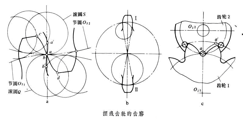 由一對擺線齒輪組成的齒輪傳動。擺線齒輪的齒廓由內(nèi)擺線或外擺線組成(圖中a[擺線齒輪的齒廓] )。滾圓S在節(jié)圓O外面滾動形成齒頂曲線bc,在節(jié)圓O內(nèi)面滾動形成齒根曲線aa;同樣,滾圓Q在O內(nèi)面滾動形成齒根曲線bb,在O外面滾動形成齒頂曲線ad。這樣的輪齒接觸傳動相當(dāng)于一對大小為O和O的摩擦輪互相滾動。擺線齒輪傳動大多用于鐘表和某些儀器,與一般齒輪傳動相比,它的特點是:①傳動時一對齒廓中凹的內(nèi)擺線與凸的外擺線嚙合,因而接觸應(yīng)力小,磨損均勻;②齒廓的重合度較大,有利于彎曲強度的改善;③無根切現(xiàn)象,最少齒數(shù)不受限制,故結(jié)構(gòu)緊湊,也可得到較大的傳動比;④對嚙合齒輪的中心距要求較高,若不能保證輪齒正確嚙合,會影響定傳動比傳動;⑤這種傳動的嚙合線是圓弧的一部分,嚙合角是變化的,故輪齒承受的是交變作用力,影響傳動平穩(wěn)性;⑥擺線齒輪的制造精度要求較高。 擺線齒輪傳動分內(nèi)外嚙合和齒條嚙合兩種。齒條的齒頂和齒根都是滾圓在直線上滾成的擺線。這種傳動還有一些變形齒廓(圖中b[擺線齒輪的齒廓] )。 滾圓尺寸對齒根曲線有影響。齒廓Ⅰ的滾圓小,齒根部兩側(cè)曲線外伸;齒廓Ⅱ的滾圓直徑恰等于節(jié)圓半徑,內(nèi)擺線變成一條節(jié)圓的半徑線。如果再用圓弧代替齒頂?shù)耐鈹[線,輪齒即變成圓和直線的組合,加工就很方便,可用成形銑刀銑削或用沖壓等方法制造。針輪傳動(圖中c[擺線齒輪的齒廓] )的節(jié)圓O同時作為齒輪1的滾圓,另一滾圓半徑為零。當(dāng)O在O上滾動時,圓周上一點a在齒輪1上畫外擺線,但由于輪齒要傳遞運動和力,a點要用圓銷來代替。這時aa只是齒輪1的理論齒廓,它的實際齒廓是圓銷中心在aa上運動時所形成的一條等距曲線。如果節(jié)圓O的半徑變?yōu)闊o窮大,針輪變?yōu)閹в袌A柱輪齒的齒條,這時齒輪1的齒廓便變?yōu)闈u開線。